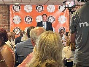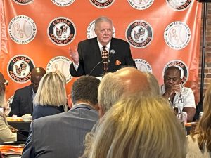 Baseball Hall of Fame pitcher and veteran broadcaster Jim Palmer introducing Tom. Jim told the story of being in Oakland with Tom for a game and came down for breakfast at 9am to find Tom eating a Boston Cream Pie. “Are you having a Boston Cream Pie for breakfast?” Jim queried. Tom replied, “It’s noon in Baltimore!”
