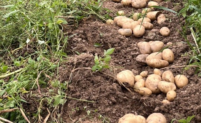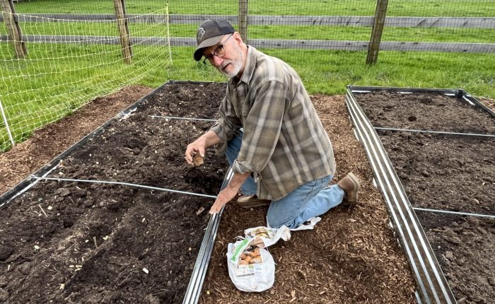 We’ve shown you how to plant the spuds in a field, now we move to the raised bed.  I said on the video we probably wouldn’t get that many out of the bed.  Of course I’m used to gettting hundreds of pounds from the field.  I don’t want to discourage you from trying this.  I’m predicting we should get 50 pounds of potatoes  out of the bed.  We’ll see.