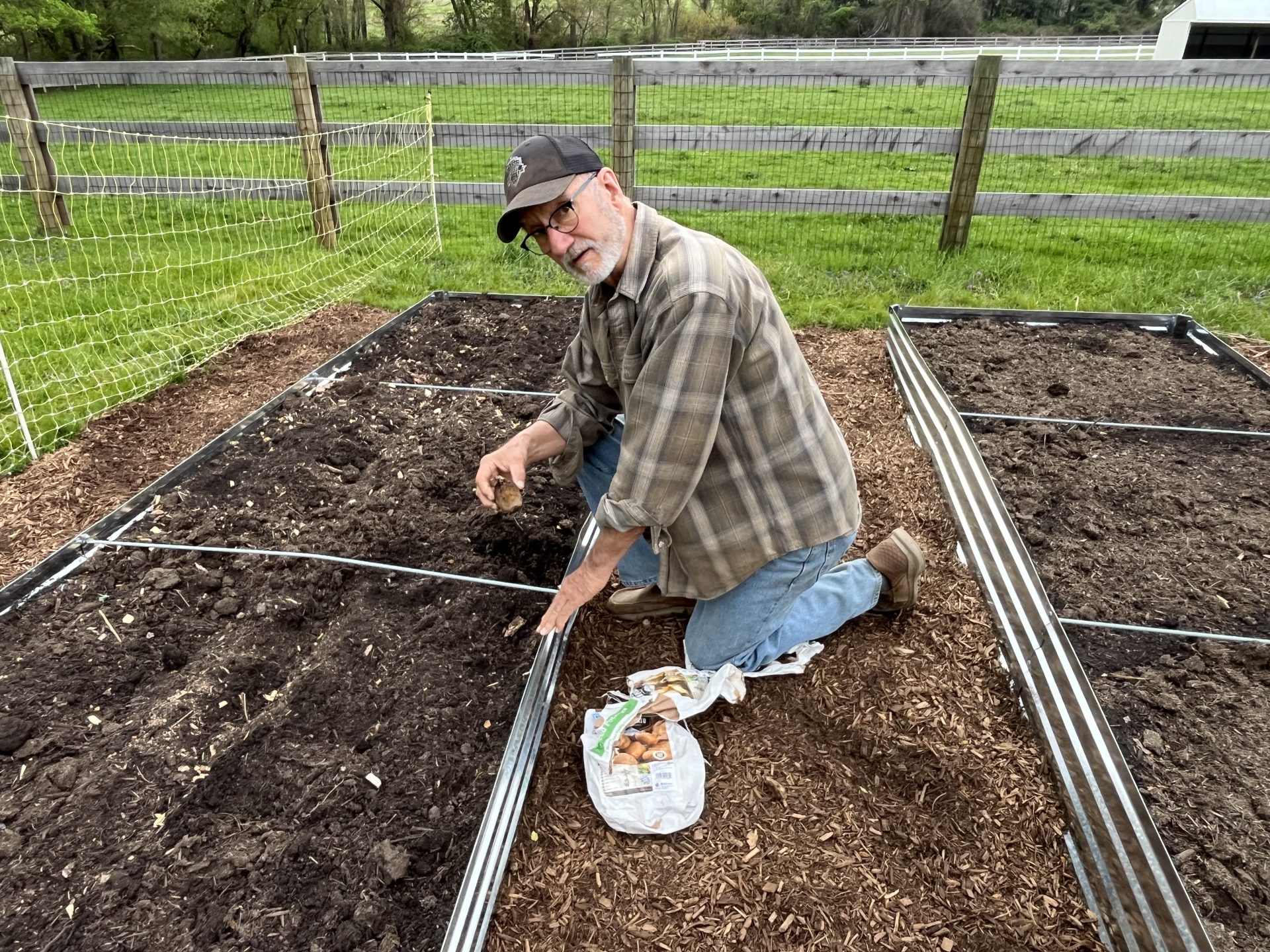 We’ve shown you how to plant the spuds in a field, now we move to the raised bed.  I said on the video we probably wouldn’t get that many out of the bed.  Of course I’m used to gettting hundreds of pounds from the field.  I don’t want to discourage you from trying this.  I’m predicting we should get 50 pounds of potatoes  out of the bed.  We’ll see.