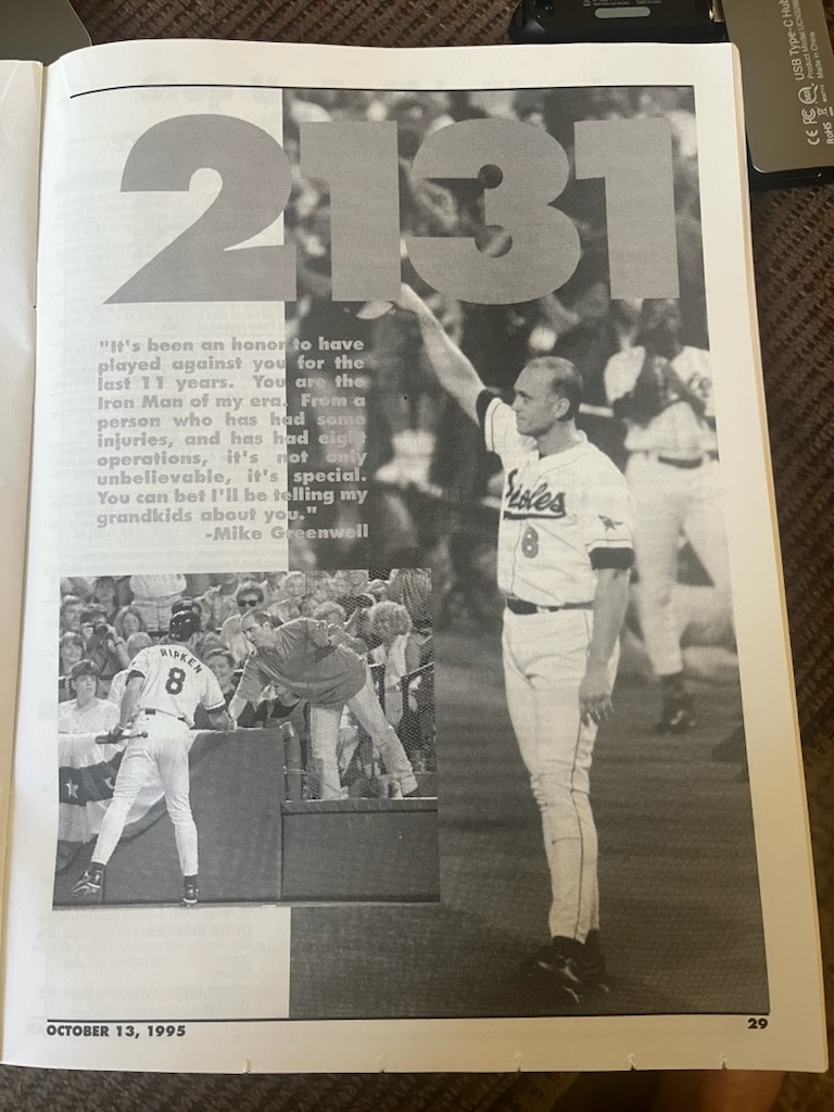 The Stevie and the Satellites song “In the Game 2131” was written by my friend Bill Fritz of his group “The Klassix” and was played the night Cal Ripken, Jr. broke the record for most